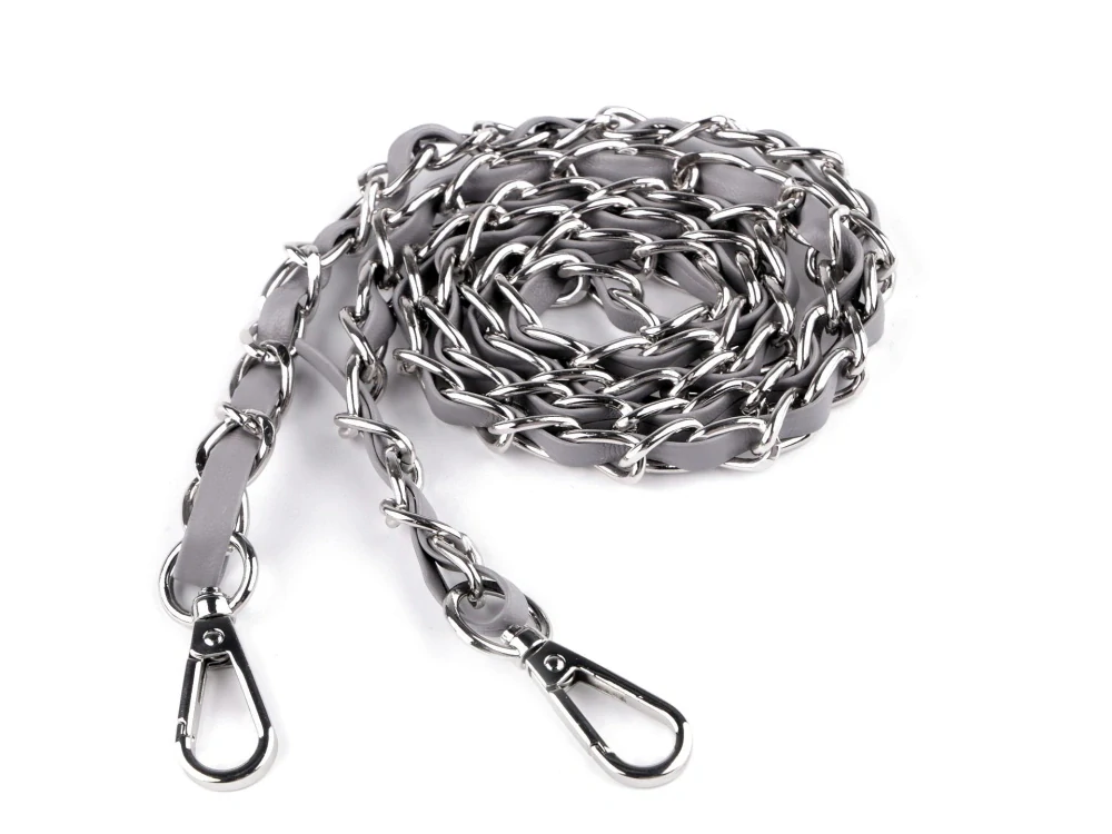 Kovový řetízek je efektně propletený řemínkem z eko kůže. Využijete ho na menší kabelky, psaníčka nebo pouzdra na mobilní telefony. Na obou jeho koncích najdete připevněné karabinky.